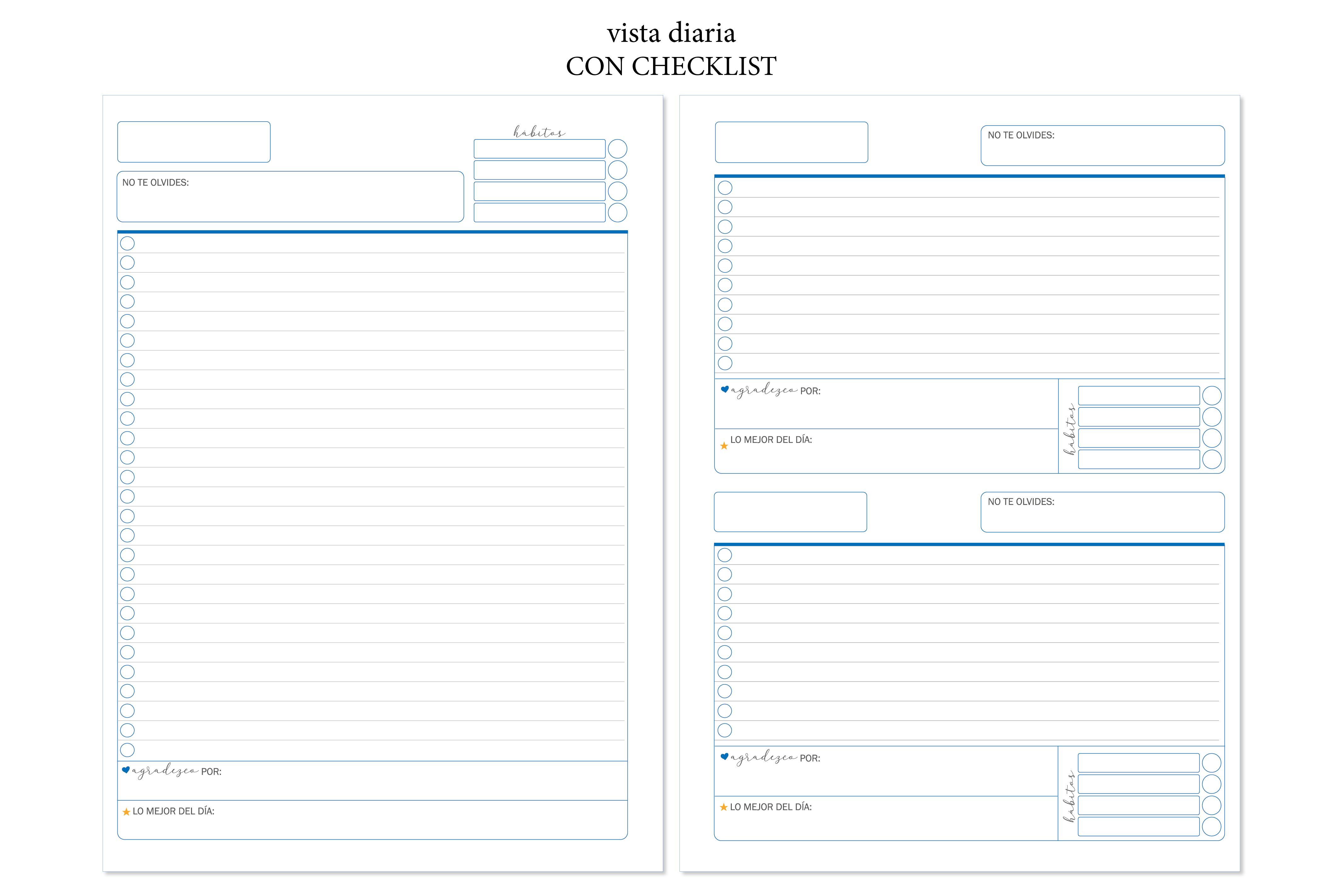 Una agenda diaria con checklist esta pensada para quienes planifican por tareas. La vista con checklist facilita anotar pendientes, priorizar lo más importante y llevar un seguimiento simple y visual del avance durante el día.