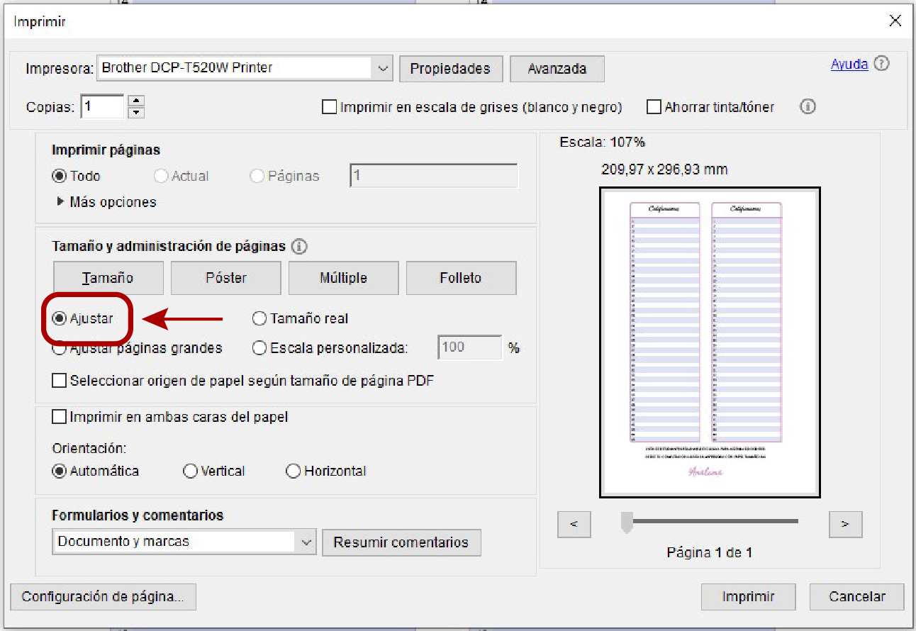 - Tamaño y Administración de páginas: debes pinchar la opción "Ajustar".